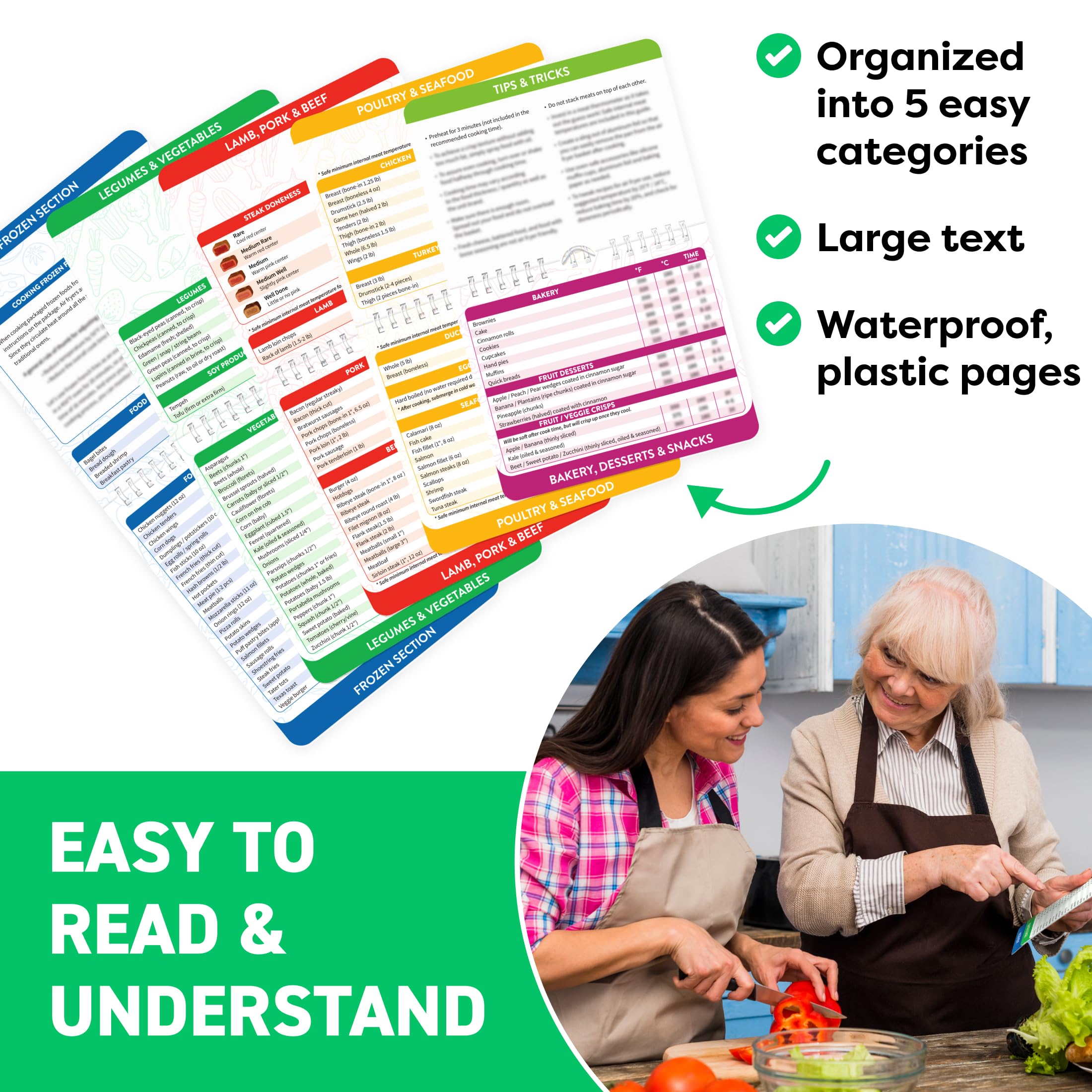 • Air fryer cooking times chart magnet, times and temp guide. Special sections include: tips & tricks, steak doneness prime rib cook temperature chart, safe minimum internal meat temps, vast Legumes & Vegetables section for vegans, and unique Bakery, Desserts & Snacks category.
