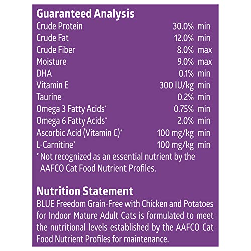 - GRAIN FREE MATURE FOOD: BLUE Freedom indoor mature cat food is formulated to help meet the unique needs of senior cats with reduced calories from fat to help maintain an ideal body weight and natural fiber sources to promote healthy digestion