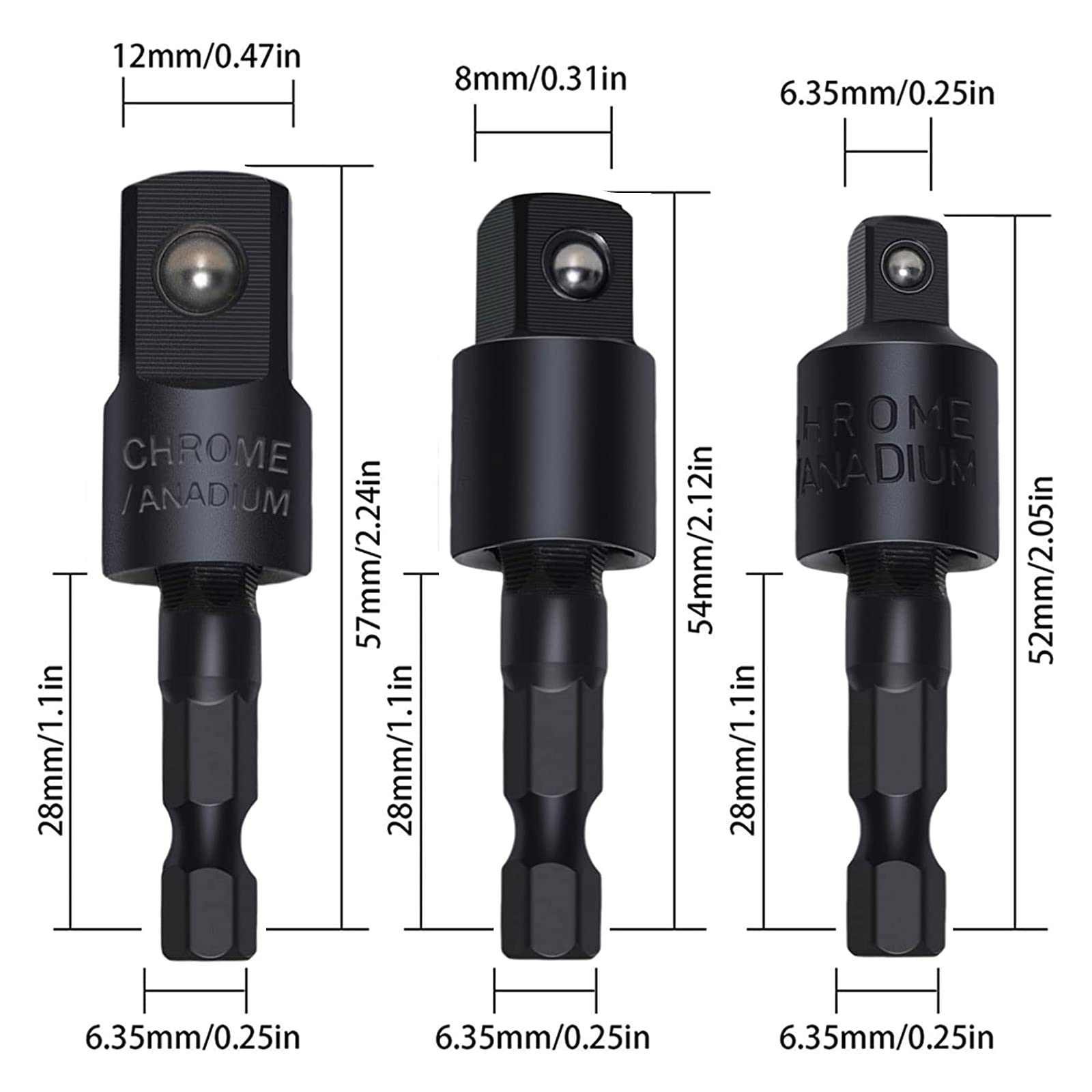 • Multifunction: 3-piece power drill sockets adapter sets, 360° rotatable hex shank impact driver socket adapter used in the installation of pneumatic screwdriver, electric screwdriver, pneumatic drill, manual screwdriver and other installation for the hexagonal tool. It is a good accessory for conversion. For universal socket, impact adapter and reducer set, universal joint set, socket adapter and drive reducer set, drive impact socket extension bar set, drive impact socket set