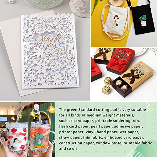 - Standard Mat:Medium viscosity.The green standard cutting pad is very suitable for all kinds of medium weight materials, such as card paper, printable soldering iron, flash card paper, pearl paper, adhesive paper, printer paper, vinyl, hand paper, wet paper, straw paper, thin fabric, embossed card paper, construction paper, window paste, printable fabric and so on.