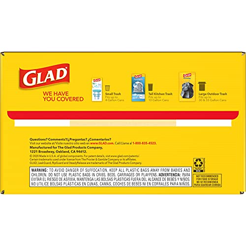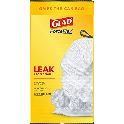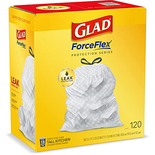 Details: Keep your trash contained with the durability and quality of Glad. Glad tall kitchen drawstring trash bags are designed with force Flex Technology to give extra flex as it expands around sharp Edges and heavy loads, so you can pack It in without ripping. These dual-layered trash bags feature Lifeguard and Leak Guard technology to resist punctures, rips and tears, and the seepage of liquids. Let the stretchable strength of Glad handle all the messes our busy daily life can throw at it and then some. The durable grips-the-can drawstring ensures that the bag stays in place, and provides a sturdy 3-ply handle making it easy to lift, carry, and toss the bag. Tough and resilient, Glad can handle some abuse, so shake the trash deeper into the bag while keeping everything contained. Take on trash with the Confidence of Glad.