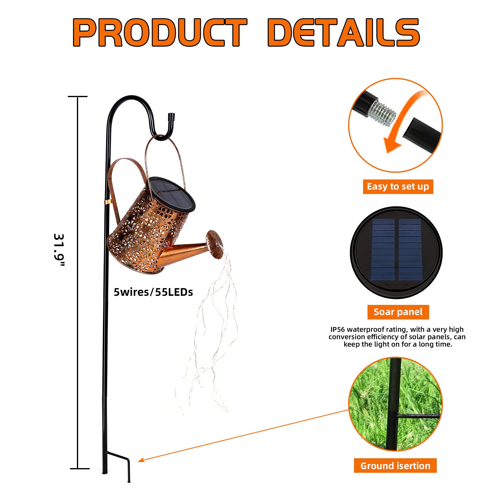 - ☀️【Solar Power and Automatic】Our solar lights have 1200mAh battery and efficient solar panel, 6-10 hours enough direct sunlight to illuminate for 8-12 hours. Also the solar watering can light comes on automatically in the evening and turns off at dawn.