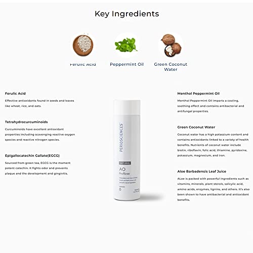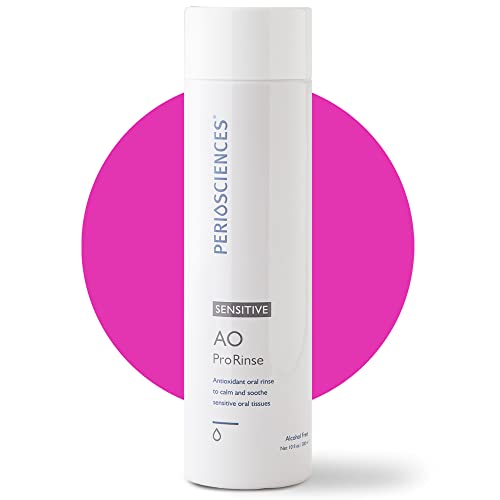 Details: SENSITIVE AO Pro Rinse is an oral rinse that refreshes breath and delivers antioxidants to soothe oral tissues. A unique combination of powerful antioxidants and dedicated extracts work in concert with our natural salivary defense system safeguarding a healthy oral environment while counteracting bad breath. The natural herbal compounds and essential oils bathe and soothe oral tissues creating a cool, mildly minty and pleasant taste. Antioxidants: Phloretin and Ferulic Acid. Soothing Natural Extract:s Witch Hazel, Prickly Ash Bark, and Allantoin. Breath Freshening: Zinc Gluconate and Zinc Lactate. FREE OF alcohol, fluoride, sodium lauryl sulfate (SLS), parabens, and artificial colors. Mild Mint Taste 10 fl oz