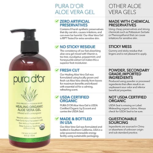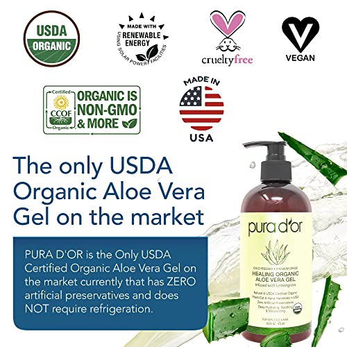 • THE ONLY USDA ORGANIC ALOE VERA GEL ON THE MARKET: PURA D’OR is the Only USDA Certified Organic Aloe Vera Gel on the market currently that has ZERO artificial preservatives and does NOT require refrigeration. Other brands are missing USDA Organic Seal on the Label which means they are not Certified Organic and any Organic claims made elsewhere are misleading and inaccurate. Always check for USDA Seal on Label