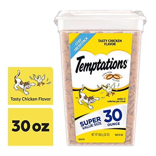• Contains one (1) 30 oz. tub of TEMPTATIONS Classic Cat Treats Tasty Chicken Flavor