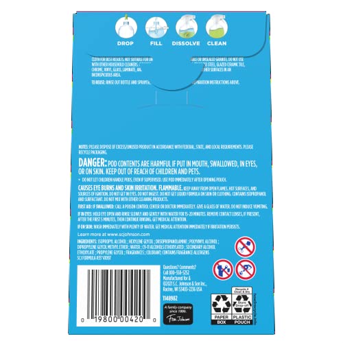 Details: The future of cleaning means using less plastic, and the future is already here with Windex® Dissolve™ Concentrated Pod Multisurface Cleaner! From the brand you love, this new and easy way to clean everyday messes and spills saves 94%* plastic with every reuse. Windex® Dissolve™ Multisurface Refill pack contains 3 Concentrated Refill Pods. Every refill helps reduce plastic waste by 94%*. Plus, it’s easy to use! Just drop a pod into the empty bottle, fill bottle up to the shoulder with warm water, twist on the sprayer, and shake until the pod dissolves. Discover the power of less, and choose dissolvable, not disposable. Windex® Dissolve™ Concentrated Pod Multisurface Cleaner packs all the cleaning power you need to make one full 26 oz. bottle of Windex® Multisurface Cleaner. It’s ideal for quick cleans, and is safe on hard surfaces, such as tiles, countertops, walls and more. This Windex® Multisurface cleaner can also be used in other household surfaces, such as sealed stone (granite, marble, quartz), stainless steel, formica, ceramic tile, sealed wood, acrylic and fiberglass. It’s perfect for quick touchups and cleanups, providing a streak-free shine with no dull residue left behind. Refilling your Windex® Dissolve™ Concentrated Pod Multisurface Cleaner is a small act that helps you reduce plastic waste. The future of cleaning is here! Little pod, big impact. Also available in these trusted brands: Scrubbing Bubbles® and fantastik® *Refill vs. 23 fl oz Windex® Sprayer Bottle