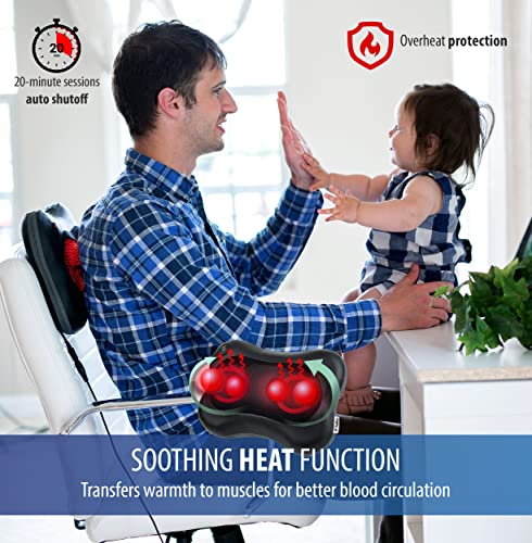 - 𝐎𝐯𝐞𝐫𝐡𝐞𝐚𝐭 𝐩𝐫𝐨𝐭𝐞𝐜𝐭𝐢𝐨𝐧 𝐚𝐧𝐝 𝐬𝐨𝐨𝐭𝐡𝐢𝐧𝐠 𝐡𝐞𝐚𝐭 𝐟𝐮𝐧𝐜𝐭𝐢𝐨𝐧: transfers warmth to your muscles for better blood circulation, helping relieve those aching muscles. Easily turn on/off the heating function with a press of a button. For safety, the back massager 𝐚𝐮𝐭𝐨𝐦𝐚𝐭𝐢𝐜𝐚𝐥𝐥𝐲 𝐬𝐡𝐮𝐭𝐬 𝐨𝐟𝐟 𝐚𝐟𝐭𝐞𝐫 𝟐𝟎 𝐦𝐢𝐧𝐮𝐭𝐞𝐬. Includes a 𝐟𝐫𝐞𝐞 𝐬𝐥𝐞𝐞𝐯𝐞 to lessen the intensity of the massage, as well as the heat.